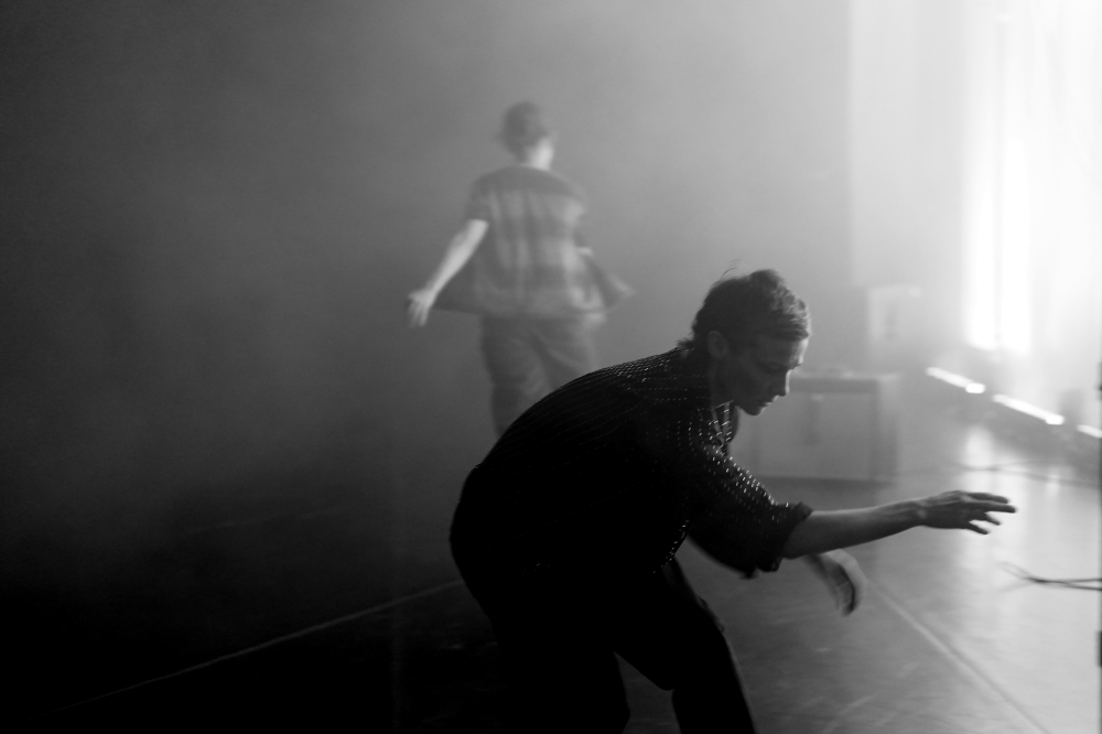Partager le vide. Le laisser résonner, s’amplifier, s’emplir d’échos, de traces; le mettre en résonance, articuler ses fréquences. Entre Sophia Dinkel et Marie Goudot — deux danseuses aux vécus, aux parcours différents — s’est inventé un langage personnel: un mode de relation — à l’autre et à l’espace — qui s’élabore dans les interstices; qui se diffracte, se contracte, construit des sas de solitude et des moments de jonction, de sédimentation ou de vertige. À l’aide de deux guitares électriques, leurs corps s’accordent, se mettent au travail.
